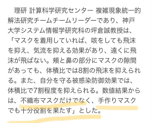 『ちゃんと着けて頂くというと言う意味であれば、布マスクも不織布も同等の効果がある実験結果はある』